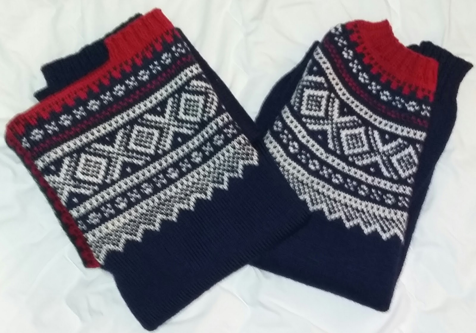 Mariusgenser i bryllupsgave kan være en fin ting å gi. Mange ønsker seg marius og det å få noe hjemmestrikket kan mange sette stor pris på. Dette tenkte iallefall en kollega av meg, så da datteren hennes skulle gifte seg ønsket hun å gi marius til både brud og brudgom. Begge genserne er i størrelse medium.